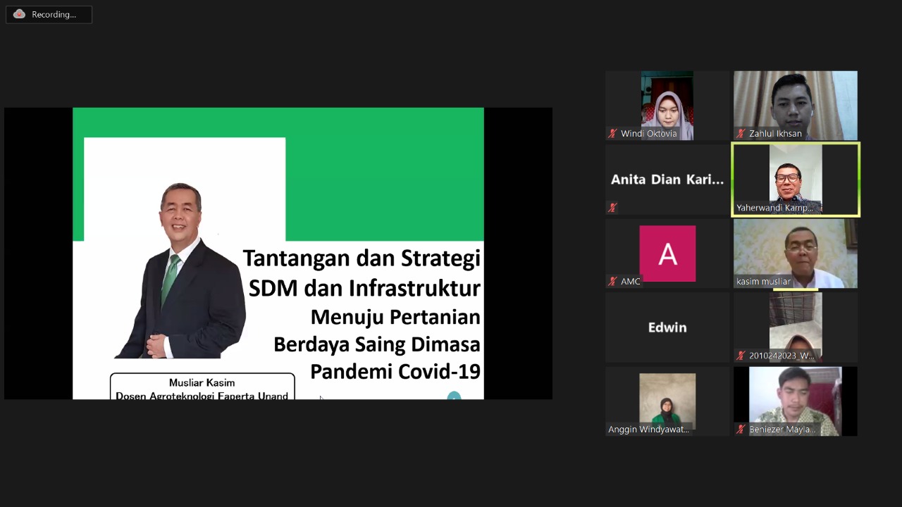 Pada Seminar tersebut, Bapak Prof. Dr. Musliar Kasim menyampaikan bahwa keadaan perekonomian negara Indonesia selama pandemi covid-19 ini tidak dalam keadaan baik, bahkan dapat dikatakan perekonomian Indonesia mengalami defisit. Namun dengan kendala perekonomian Indonesia yang seperti itu, sektor pertanian tetap harus melakukan pekerjaannya. Petani saat ini tetap berproduksi, namun mengalami beberapa kendala, seperti dalam pemasaran, terutama petani yang belum biasa menjual produk secara daring.